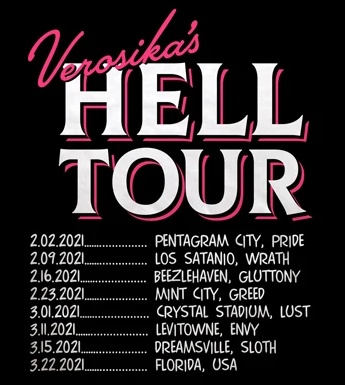 - A shirt of "Verosika's Hell Tour" in SharkRobot merchandise shows the names of several locations across the Rings of Hell: Los Satanio for Wrath, Beezlehaven for Gluttony, Mint City for Greed, Crystal Stadium for Lust, Levitowne for Envy, and Dreamsville for Sloth.[5][6] However, it is currently not known whether the information listed on the shirt is canon in the show.