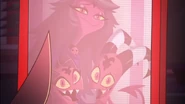 After Blitzo returns home from a bad night, depressed, he lays on his couch and looks through photos on his phone, breaking down into tears when seeing a picture of his mother and sister.